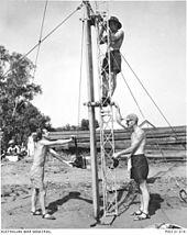An advance party of No. 5 Airfield Construction Squadron from RAAF Base Williamtown, New South Wales, moved to Onslow in August 1951 with heavy construction equipment, taking the train to Geraldton and then the road to Onslow. This was then transported to the Monte Bello Islands. A prefabricated hut was taken across by Karangai, along with equipment for establishing a meteorological station. Other materiel was moved from Onslow to the islands in 45-cubic-metre (40 MTON) lots in an ALC-40 landing craft manned by the Australian Army and towed by Karangai. This included two 25-tonne (25-long-ton) bulldozers, a grader, tip trucks, portable generators, 1,800-litre (400 imp gal) water tanks and a mobile radio transceiver. The hut was erected, and the meteorological station henceforth manned by an RAAF officer and four assistants. Roads and landings were constructed, and camp sites established.[70]