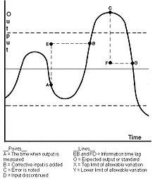 The most serious problem in information flow arises when the delay in feedback is exactly one-half cycle, for then the corrective action is superimposed on a variation from norm which, at that moment, is in the same direction as that of the correction. This causes the system to overcorrect, and then if the reverse adjustment is made out of cycle, to correct too much in the other direction, and so on until the system fluctuates ("oscillates") out of control. This phenomenon is illustrated in Figure 1. “Oscillation and Feedback”. If, at Point A, the trend below standard is recognized and new inputs are added, but not until Point B, the system will overreact and go beyond the allowable limits. Again, if this is recognized at Point C, but inputs are not withdrawn until Point D, it will cause the system to drop below the lower limit of allowable variation.[7]