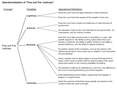 The above discussion links operationalization to measurement of concepts. Many scholars have worked to operationalize concepts like job satisfaction, prejudice, anger etc. Scale and index construction are forms of operationalization. There is not one perfect way to operationalize. For example, in the United States the concept distance driven would be operationalized as miles, whereas kilometers would be used in Europe.[16]