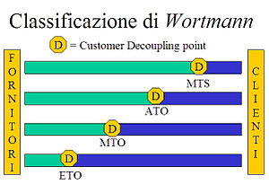 Another possible classification[37] is one based on Lead Time (manufacturing lead time vs delivery lead time): engineer to order (ETO), purchase to order (PTO), make to order (MTO), assemble to order (ATO) and make to stock (MTS). According to this classification different kinds of systems will have different customer order decoupling points (CODP), meaning that work in progress (WIP) cycle stock levels are practically nonexistent regarding operations located after the CODP (except for WIP due to queues). (See Order fulfillment)