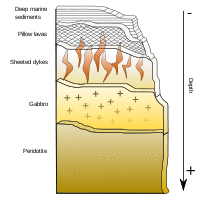 Several studies support the conclusion that ophiolites formed as oceanic lithosphere. Seismic velocity structure studies have provided most of the current knowledge of the oceanic crust's composition. For this reason, researchers carried out a seismic study on an ophiolite complex (Bay of Islands, Newfoundland) in order to establish a comparison. The study concluded that oceanic and ophiolitic velocity structures were identical, pointing to the origin of ophiolite complexes as oceanic crust.[8] The observations that follow support this conclusion. Rocks originating on the seafloor show chemical composition comparable to unaltered ophiolite layers, from primary composition elements such as silicon and titanium to trace elements. Seafloor and ophiolitic rocks share a low occurrence of silica-rich rocks; those present have a high sodium and low potassium content.[9] The temperature gradients of the metamorphosis of ophiolitic pillow lavas and dykes are similar to those found beneath ocean ridges today.[9] Evidence from the metal-ore deposits present in and near ophiolites and from oxygen and hydrogen isotopes suggests that the passage of seawater through hot basalt in the vicinity of ridges dissolved and carried elements that precipitated as sulfides when the heated seawater came into contact with cold seawater. The same phenomenon occurs near oceanic ridges in a formation known as hydrothermal vents.[9] The final line of evidence supporting the origin of ophiolites as seafloor is the region of formation of the sediments over the pillow lavas: they were deposited in water over 2 km deep, far removed from land-sourced sediments.[9] Despite the above observations, there are inconsistencies in the theory of ophiolites as oceanic crust, which suggests that newly generated ocean crust follows the full Wilson cycle before emplacement as an ophiolite. This requires ophiolites to be much older than the orogenies on which they lie, and therefore old and cold. However, radiometric and stratigraphic dating has found ophiolites to have undergone emplacement when young and hot:[9] most are less than 50 million years old.[10] Ophiolites therefore cannot have followed the full Wilson cycle and are considered atypical ocean crust.