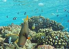 While other balistoid fishes, such as the filefish and leatherjacks, are typically found all across the Indo-western Pacific, the triggerfish are typically found in coral reefs ecosystems, coral lagoons, and external reef slopes within this area, as well off the coast of east Africa, the Red Sea, and Japan.[6][7][4] They tend to stay around their burrows and dens within the reef.[8] Within coral reefs, the orange-lined triggerfish are more versatile than other triggerfish species and can be found at depths up to 50 meters, although studies have found that they prefer depths of 2 to 8 meters.[9][4] No relationship between the area of the reef and depth has been found in juveniles, and adults were found to vary their depth based on the region; in general, the species was found to have a broad distribution across the reef.[9] There is also a difference between the types of substrata that the adults and juvenile orange-lined triggerfish prefer: the adults were found to prefer rock and branching coral, while the juvenile fish were found to prefer softer surfaces.[9]