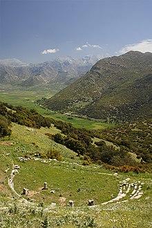 The plain is divided into two by hills projecting from the eastern and western ranges, and which approach so close as to allow space for only a narrow ravine between them. Upon the summit of the western hill stood the acropolis of Orchomenus, nearly 900 m (3,000 ft) high, resembling the strong fortress of Messenian Ithome and, like the latter, commanding two plains. The waters of the southern part of the plain run through the ravine into the northern plain where, as there is no outlet for the waters, they formed a large lake. This description is that of Pausanias’ time, AD 110 – ca. 180). Today the lake is gone. The two plains are characterized as closed geological basins (Karst depressions), where, even today, precipitation has a seasonally inadequate subsurface drainage by ditches, Katavothres (Greek term for ponors) and a man made tunnel.[2]