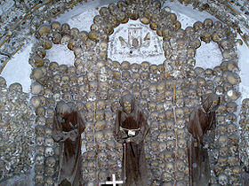 The crypt, or ossuary, now contains the remains of 4,000 friars buried between 1500–1870, during which time the Roman Catholic Church permitted burial in and under churches. The underground crypt is divided into five chapels, lit only by dim natural light seeping in through cracks, and small fluorescent lamps. The crypt walls are decorated extensively with the remains, depicting various religious themes. Some of the skeletons are intact and draped with Franciscan habits, but for the most part, individual bones are used to create the elaborate ornamental designs.