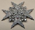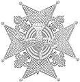 For the ceremonies of the Order and when the knights of the Order made their Communion, the knights wore a long black velvet mantle sprinkled with embroidered gold and red flames and with a representation of the collar round its edges embroidered in gold, red and silver. Like the royal mantle, this mantle opened on the right side and just as an ermine shoulder cape covered the top of the royal mantle, a shoulder cape of pale green velvet with the same embroidery but smaller was worn over this mantle and formed the upper part of it. Both the mantle proper and the shoulder cape were lined with a yellowish orange satin.[3] The mantle was worn over a white coat (with the star of the Order embroidered on the left breast), waistcoat and puffed hose, heavily embroidered with silver. A black hat with a white plume completed the dress. The star of the Order had the same design as the front of the badge, but embroidered in silver (later a medal star in silver was used) on both the knights' coats and their vests.