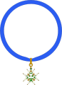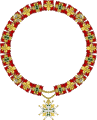 The badge of the Order is a gold Maltese cross with white borders, each of the eight points ending in a gold ball (points boutonnées) and with a gold fleur-de-lys between each adjacent pair of its arms. At the center of the cross, was set a white dove descending (i.e., with its wings and head pointing downward) surrounded by green flames. The back of this cross worn by the knights was the same as the front except with the medallion of the Order of Saint Michael at the center rather than the dove and flames (those of ecclesiastical members were the same on the back as on the front). During the ceremonies, the cross of officers and commanders officers was attached to a collar of links of gold fleur-de-lis alternating with links consisting of a white enameled letter H (the first initial of name of the founder) crowned with a gold French royal crown, with identical crowns on either side of it or alternately with a trophy of weapons. Each of these links was surrounded with red enamel flames forming a square around it.[1][2] More generally, the cross was suspended from a large ribbon of color moirée blue sky, hence the nickname cordon bleu the knights wore.