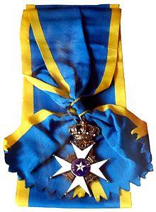 - The badge of the Order is a white enamelled Maltese Cross, in silver for the Officer class and in gilt for Officer 1st Class and above; crowns appear between the arms of the cross. The central disc, which is identical on both sides, is in blue enamel, with a white-enamelled five-pointed star surrounded by the motto "Nescit occasum" (It knows no decline). The badge hangs from a royal crown.