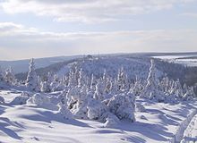 The climate of the higher regions of the Ore Mountains is characterised as distinctly harsh. Temperatures are considerably lower all year round than in the lowlands, and the summer is noticeably shorter and cool days are frequent. The average annual temperatures only reach values of 3 to 5 °C. In Oberwiesenthal, at a height of 922 m above sea level (NN), on average only about 140 frost-free days per year are observed. Based on reports of earlier chroniclers, the climate of the upper Ore Mountains in past centuries must have been even harsher than it is today. Historic sources describe hard winters in which cattle froze to death in their stables, and occasionally houses and cellars were snowed in even after snowfalls in April. The population was regularly cut off from the outside world.[8] The upper Ore Mountains was therefore nicknamed Saxon Siberia already in the 18th century.[9]