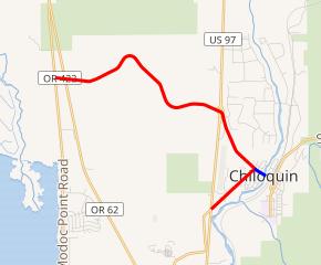 OR 422 begins at an intersection with Modoc Point Road approximately one mile south of Klamath Agency and heads east, crossing OR 62 0.16 miles (0.26 km) east of the start of the route.[5] OR 422 then continues east, crossing US 97 approximately 1-mile (1.6 km) west of Chiloquin and turning southeast into Chiloquin.[5][6] At the intersection of Chocktoot Street and Chiloquin Road in Chiloquin, OR 422S heads southeast along Chocktoot Street and OR 422 turns southwest along Chiloquin Road, ending at an intersection with US 97 approximately 0.60 miles (0.97 km) beyond the city limits.[6]