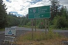 In Forest Grove, OR 47 intersects Oregon Route 8,[3] and the Tualatin Valley Highway leaves Oregon Route 47, and continues east towards Hillsboro and Beaverton on Oregon Route 8. North of the intersection, OR 47 is known as the Nehalem Highway. It continues north, passing through the town of Banks.[3] North of Banks, OR 47 shares an alignment for about 4 miles (6 km) with U.S. Route 26 over the Sunset Highway, which is—a bit confusingly—Highway 47. North of Manning, OR 47 and US 26 part ways. OR 47 continues north, following the North Fork of Dairy Creek to its source and passing L.L. "Stub" Stewart Memorial State Park[4] and shortly thereafter reaching the summit called "Tophill" where the highway departs the Willamette River drainage and enters the Nehalem drainage. From Tophill, the highway quickly winds down to a tributary of the Nehalem River and finds the Nehalem River at the extinct community of Treharne.