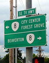 Oregon Route 8, also known as Oregon Highway 8, is an Oregon state highway which serves the western suburbs of Portland. The road is locally known as Canyon Road and Tualatin Valley Highway, and travels through the center of the Tualatin Valley. Oregon 8 is located entirely within Washington County. The portion of the route from US 26 to Oregon Route 47 is part of the National Highway System, listed as a principal arterial.[1]