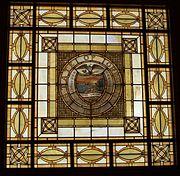 Prior to the completion of the Oregon State Library Building in 1939 the state library was located in the basement and first floor of the Supreme Court Building.[7] As this building and the Oregon State Capitol were connected by tunnels used for utilities, the fire that destroyed the capitol in 1935 also damaged the library.[7] This was due to all the water that was used to fight the fire drained into the basement and destroyed many books in the library.[7] On October 12, 1962, during the Columbus Day Storm that caused an estimated $170 million in damages, the decorative stained-glass skylight in the courtroom was damaged.[8] The original stained-glass piece was created by Povey Brothers Art Glass Works, who were the premier artisans of that trade in the Northwest from 1888 to 1929.[9]