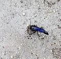The organ pipe mud dauber (Trypoxylon politum) is a predatory wasp in the family Crabronidae. They are fairly large wasps, ranging from 3.9–5.1 cm, and have been recorded to fly from May to September. Female and male are similar in colour, a shiny black with pale yellow to white hind hindtarsomere.[1] The organ pipe mud dauber feeds mainly on three genera of spider: Neoscona, Araneus, and Eustala.[2] Melittobia, a parasitoid wasp, is a common ectoparasite of T. politum prepupae.[3] Other sources of parasitism include the Bombyliid fly Anthrax, Chrysidid wasps, and various species of scavenger flies (Miltogramminae).[4] The tufted titmouse (Parus bicolor) is a known predator of T. politum, and may feed on them more commonly than previously thought as the holes made by the titmouse are similar in shape and size to those made by T. politum leaving the nest after pupation.[5]