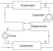 In the case of a "dry fluid", the cycle can be improved by the use of a regenerator: since the fluid has not reached the two-phase state at the end of the expansion, its temperature at this point is higher than the condensing temperature. This higher temperature fluid can be used to preheat the liquid before it enters the evaporator.