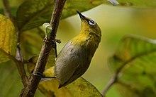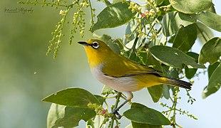 The Indian white-eye (Zosterops palpebrosus), formerly the Oriental white-eye, is a small passerine bird in the white-eye family. It is a resident breeder in open woodland on the Indian subcontinent. They forage in small groups, feeding on nectar and small insects. They are easily identified by the distinctive white eye-ring and overall yellowish upperparts. The range previously extended eastwards to Southeast Asia, Indonesia and Malaysia but when the taxa in these regions were assigned to other species, the English name was changed.