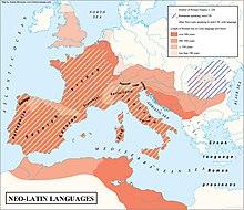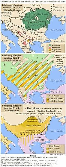 Romanians, known by the exonym Vlachs in the Middle Ages,[53] speak a language descended from the Vulgar Latin that was once spoken in south-eastern Europe.[54][55] Inscriptions from the Roman period prove that a line, known as the "Jireček Line", can be drawn through the Balkan Peninsula, which separated the Latin-speaking northern provinces, including Dacia, Moesia and Pannonia from the southern regions where Greek remained the predominant language.[56] Balkan Romance now has four variants,[57] which are former dialects of a Proto-Romanian language.[58][59] Daco-Romanian, the official language of Romania, is the most widespread of the four variants.[58] Speakers of the Aromanian language live in scattered communities in Albania, Bulgaria, Greece and North Macedonia.[58] Another two, by now nearly extinct variants, Megleno-Romanian and Istro-Romanian, are spoken in some villages in North Macedonia and Greece, and in Croatia, respectively.[58] Aromanian and Megleno-Romanian are spoken in the central and southern regions of the Balkans, indicating that they migrated to these territories in the Middle Ages.[60][61]