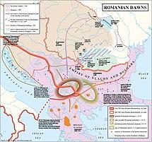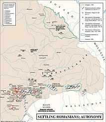 A charter of 1247 of King Béla IV of Hungary lists small Romanian polities existing north of the Lower Danube.[44] Thomas Tuscus mentioned Vlachs fighting against the Ruthenes in 1276 or 1277.[51][300] References to Vlachs living in the lands of secular lords and prelates in the Kingdom of Hungary appeared in the 1270s.[301] First the canons of the cathedral chapter in Alba Iulia received a royal authorization to settle Romanians to their domains in 1276.[302] Thereafter, royal charters attest the presence of Romanians in more counties, for instance in Zaránd from 1318, in Bihar and in Máramaros from 1326, and in Torda from 1342.[303] The first independent Romanian state, the Principality of Wallachia, was known as Oungrovlachia ("Vlachia near Hungary") in Byzantine sources, while Moldavia received the Greek denominations Maurovlachia ("Black Vlachia") or Russovlachia ("Vlachia near Russia").[304]