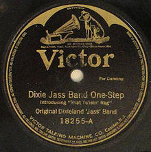 The band then recorded two sides for the Victor Talking Machine Company, "Livery Stable Blues" and "Dixieland Jass Band One-Step", on February 26, 1917 at Victor's New York studios.[11] These titles were released as Victor 18255 in May 1917, the first issued jazz record.[12][13] The band's recordings, first marketed as a novelty, were a surprise hit, and gave many Americans their first taste of jazz. Musician Joe Jordan sued, since the "One Step" incorporated portions of his 1909 ragtime composition "That Teasin' Rag". The record labels subsequently were changed to "Introducing 'That Teasin' Rag' by Joe Jordan". A court case dispute over the authorship of "Livery Stable Blues" resulted in the judge declaring the tune in the "public domain".