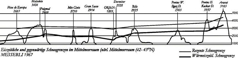 Mediterranean mountains bear no glaciers any more except small snow fields in some shaded cirques of the Taurus range. Even during the pleistocene snowlines were not much lower as in today's Alps. Glaciers were only of local significance in the Mediterranean enabling frost sensitive vegetation types to survive the climate changes of the Quaternary. Among the once glaciated Mediterranean mountains Orjen was outstanding for one of the biggest ice cap in the region. A 150 km² covered 1/3 of the area. All part above 900 m were buried under a thick sheet of ice from where several glacial tongues descended to 500 m above sea level. Traces of glacial activity are evident in any part of Orjen as in the Bijela gora plateaux. No glacial lakes survive today as they were extinguished due to the porosity of the karstified landscape. Many cirques, U-shaped valleys and moraines and jagged ridges and summits bear the evidence of the glacial erosion. In stoneage and Bronze Age humans settled in the Orjen region. This early human activity is depicted by rock paintings of deerhunt and humans in Lipci in Risan bay. A major Bronze Age excavation site is at Popovo polje to the north of Mount Orjen.