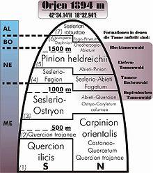| 1,100- 1,450 | Oromediterranean NE= Nemoral (temperate zone) | Seslerio autumnalis–Fagetum (Horv.) Wrab. (Sesleria autumnalis, Fagus sylvatica), Pinion heldreichii (Pinus heldreichii), Oreoherzogio-Abietetum illyricae Fuk. (basic soil, Abies alba), Seslerio autumnalis–Abietetum illyriacae (Horv.) Fuk. |