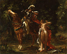 In his poem Ludovico Ariosto relates how Marphise, the woman warrior, knocks the knight Pinabello off his horse after his lady had mocked Marphise's companion, the old woman Gabrina. In Marphise by Eugène Delacroix, Pinabello lies on the ground, and his horse gallops off in the distance. The knight's lady, meanwhile, is forced to disrobe and give her fancy clothing to Gabrina. Marphise's horse, undisturbed by the drama, nonchalantly munches on the leaves overhead.