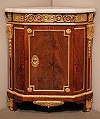 Louis XVI Parisian corner cabinet; by Jean Henri Riesener; 1780–1790; oak, mahogany, marble, and ormolu mounts; 94.3 × 81.3 × 55.9 cm; Art Institute of Chicago (US)[4]