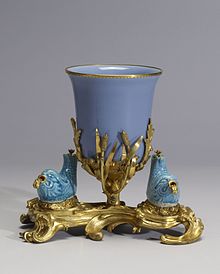 Chinese and European porcelains mounted in gilt-bronze were luxury wares that heightened the impact of often-costly and ornamental ceramic pieces sometimes used for display. Chinese ceramics with gilt-bronze mounts were produced under the guidance of the Parisian marchands-merciers, for only they had access to the ceramics (often purchased in the Netherlands) and the ability to overleap the guild restrictions. A few surviving pieces of 16th-century Chinese porcelain subsequently mounted in contemporary European silver-gilt, or vermeil, show where the foundations of the later fashion lay.