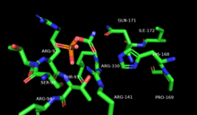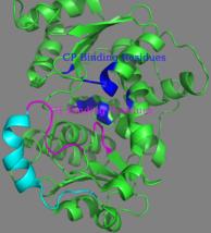 Ser-Thr-Arg-Thr-Arg motif from one subunit and a His from the neighboring subunit both interact with the phosphate group of CP for binding. Binding the primary nitrogen of CP are residues Gln, Cys, and Arg. The carbonyl oxygen of CP is bound by residues Thr, Arg, and His.[10]
