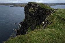 The eastern part of the island, which faces Skye, is low-lying grass land, while the western part rises until it reaches several cliffs, up to 72 metres (240 ft) in height.[5] Views from the westward side are to the Atlantic, Idrigill Point, Macleod's Maidens, with the much larger island of Wiay c.0.8 miles north-west, behind which the flat tops of Healabhal Bheag and Healabhal Mhòr (Macleod's Tables) dominate from the Duirinish Peninsula.