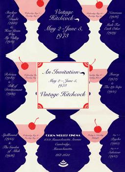 The Orson Welles Cinema’s advertising and promotion were under the direction of John Fogle,[7] with ad and poster copy written by Fogle and Larry Jackson. The Welles Cinema’s posters were designed by Jean Fogle. Extra runs of these posters were sold in the lobby. Among Fogle’s outstanding creations was Vintage Hitchcock, a 13" x 18" poster she designed for a month-long Hitchcock series held in 1973.