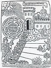 The possibility of progress is embedded in the mediaeval great chain of being, with a linear sequence of forms from lowest to highest. The concept, indeed, had its roots in Aristotle's biology, from insects that produced only a grub, to fish that laid eggs, and on up to animals with blood and live birth. The mediaeval chain, as in Ramon Lull's Ladder of Ascent and Descent of the Mind, 1305, added steps or levels above humans, with orders of angels reaching up to God at the top.[17]