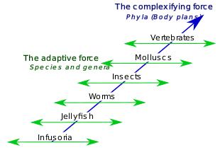 Orthogenesis, also known as orthogenetic evolution, progressive evolution, evolutionary progress, or progressionism, is the biological hypothesis that organisms have an innate tendency to evolve in a definite direction towards some goal (teleology) due to some internal mechanism or "driving force".[2][3][4] According to the theory, the largest-scale trends in evolution have an absolute goal such as increasing biological complexity. Prominent historical figures who have championed some form of evolutionary progress include Jean-Baptiste Lamarck, Pierre Teilhard de Chardin, and Henri Bergson.