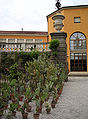 The design of the Botanical Garden is commonly attributed to Andrea Moroni, who created some of the most important public monuments in Padua, such as the Basilica di Santa Giustina in Prato della Valle, the town hall and the university in the first half of the 16th century. However, the real architect was Daniele Barbaro, a Venetian nobleman who was a man of vast learning and translator of Vitruvius' De Architectura.[2] He followed the example of the medieval Horti Conclusi, (enclosed gardens), marking the architecture by a perfect pattern of a square within a circle, divided into four parts by two paths oriented according to the cardinal points. The Botanical Garden was inaugurated in 1545, and used as a teaching facility by the University of Padua in the following year.