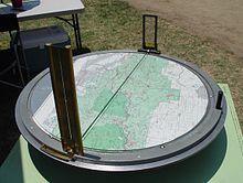 The system is composed of a topographic map of the area oriented and centered on a horizontal table with a circular rim graduated in degrees (and fractions). Two sighting apertures are mounted above the map on opposite sides of the ring and slide around the arc.