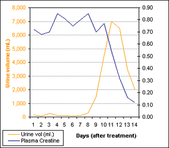 The kidney's resorptive mechanisms are particularly energetic, using nearly 100% of the O2 supplied. Thus, the kidney is particularly sensitive to reduction in blood supply. This phenomenon occurs because renal flow is restored prior to the normal resorption function of the renal tubule. As you can see in the graph, urine flow recovers rapidly and subsequently overshoots the typical daily output (between 800 mL and 2L in most people). Since the kidney's resorption capacity takes longer to re-establish, there is a minor lag in function that follows recovery of flow. A good reference range for plasma creatinine is between 0.07 - 0.12 mmol/L.[8]