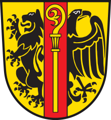 | The imperial eagle to the right represents the free imperial cities in the district, especially the city of Aalen. The lion on the left is the symbol of the Staufen family, who founded the city of Schwäbisch Gmünd. These two symbols were taken from the coats of arms of the two precursor districts. The crosier in the middle represents Ellwangen Abbey, which possessed many smaller areas scattered in the district. |
