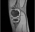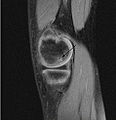 Magnetic resonance imaging (MRI) is useful for staging OCD lesions, evaluating the integrity of the joint surface, and distinguishing normal variants of bone formation from OCD by showing bone and cartilage edema in the area of the irregularity. MRI provides information regarding features of the articular cartilage and bone under the cartilage, including edema, fractures, fluid interfaces, articular surface integrity, and fragment displacement.[37][38] A low T1 and high T2 signal at the fragment interface is seen in active lesions. This indicates an unstable lesion or recent microfractures.[30] While MRI and arthroscopy have a close correlation, X-ray films tend to be less inductive of similar MRI results.[38]