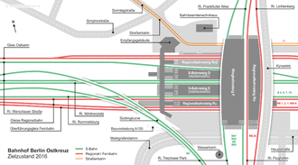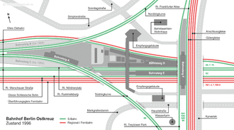Concrete plans for rebuilding Ostkreuz station were included in a project for "improving the Berlin railway node" after German reunification. This project was classified in the federal railway development act (Bundesschienenwegeausbaugesetz) as an "absolute priority" and it aimed to improve the performance of the networks of the long-distance, regional and S-Bahn railways in Berlin and to improve urban transport significantly.[18]