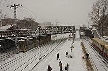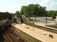 The station was named after the nearby villages of Stralau and Rummelsburg. The halts of Stralau on the Ringbahn and Rummelsburg on the Silesian Railway were closed with the opening of the new station.[5] The station was owned jointly by the Eastern Railway, the Silesian Railway and the Ringbahn.[5] It had a platform (later platform A) between the two connecting curves, an "intermediate" platform (in Germany, a low island platform with one platform edge and sometimes accessed by passengers across a rail track) on each of the curves connecting in opposite directions and a side and intermediate platform on the tracks of the Silesian Railway.[6] There was no platform on the tracks of the Eastern Railway, so its trains stopped at the platforms of the Silesian Railway if necessary. There was a crossover east of the station and another crossover at the present Modersohn bridge to the west of the station.[7] As there was no platform on the through Ringbahn tracks, no passenger trains stopped on it. The suburban trains of the Ringbahn coming from both the north and south ran via the connecting curves to Stralau-Rummelsburg station on the Stadtbahn and vice versa in the opposite direction. Stralau-Rummelsburg was also the end or starting point for some trains running on the Stadtbahn.