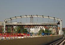 Pre-construction work began in the spring and summer of 2006 with the demolition of old buildings and the removal of vegetation. The ground-breaking ceremony was scheduled for 16 January 2007 but it had to be postponed.[24] Construction started with the building of a bridge over the railway tracks for Kynaststraße, to the east of the station. In February 2008, a temporary pedestrian bridge was installed connecting the entrances of the station with platforms D and E. It replaced the old heritage-listed bridge, which had to be demolished for the construction, but it was intended to faithfully recreate it after the completion of the station.