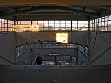 The station was greatly in need of renovation for decades and was not capable of handling peak hour traffic partly due to its narrow stairs. For a long time there were proposals to restructure it in order to make the stairs and passages more usable. In the mid-1950s, the Berliner Zeitung surveyed its readers for ideas to improve the situation.[11] As a result, Deutsche Reichsbahn announced in early 1956 that the stairs from the Ringbahn platform to the low-level platform D would be widened by one metre. However, a complete renovation of the station would be necessary after this "small solution" was carried out.[12] Planning for more extensive remodelling continued. In 1957, the construction of a second Ringbahn platform west of the existing platform to relieve congestion was considered.[13] In 1959, it was announced that the reconstruction of the railway station would begin in 1962 or 1963.[14] This would involve the construction of a six-metre-wide tunnel below the lower platforms to connect with both the station's entrance hall and the broad steps down from the lower platforms. Provision was made for the construction of escalators. It was expected to cost 7.5 million marks.[15] In 1986, Erich Honecker announced the beginning of the "complex reconstruction" of the Ostkreuz S-Bahn junction for the period up to 1990.[16]
