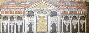The Basilica of Sant'Apollinare Nuovo, its baptistry, and the Archiepiscopal Chapel follow the typical late Roman architectural and decorative motifs, but the Mausoleum of Theodoric displays purely Gothic elements, such as its construction not from the usual brick, but of massive slabs of Istrian limestone, or the 300-ton single-piece roof stone.
