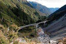 The Otira viaduct is to the south of Otira, between Otira and the Arthur's Pass summit. Completed in 1999 by McConnell Smith Pty Ltd, the 440 metres (1,440 ft) four-span viaduct carries State Highway 73 over a stretch of unstable land, replacing a narrow, winding, dangerous section of road that was prone to avalanches, slips and closures.[16]