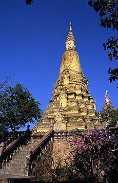Oudong (Khmer: ឧដុង្គ) (also romanized as Udong or Odong) is an ancient town of the post-Angkorian period (1618-1863 C.E) situated in present-day Phsar Daek Commune, Ponhea Lueu District, Kandal Province, Cambodia.[1] Located at the foothill of the mountain Phnom Oudong, also known as Phnom Preah Reach Troap (Khmer: ភ្នំព្រះរាជ្យទ្រព្យ), about 35 km northwest of the modern capital Phnom Penh via National Road No. 5, Oudong was royal residence and Cambodia's capital for more than 250 years until 1866. A monumental royal necropolis of sovereigns of several centuries is scattered on top the prominent bisected mountain, which runs from the southeast to the northeast.[2][3]