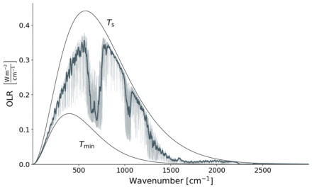 OLR is a critical component of the Earth's energy budget, and represents the total radiation going to space emitted by the atmosphere.[3] OLR contributes to the net all-wave radiation for a surface which is equal to the sum of shortwave and long-wave down-welling radiation minus the sum of shortwave and long-wave up-welling radiation.[4] The net all-wave radiation balance is dominated by long-wave radiation during the night and during most times of the year in the polar regions.[5] Earth's radiation balance is quite closely achieved since the OLR very nearly equals the Shortwave Absorbed Radiation received at high energy from the sun. Thus, the Earth's average temperature is very nearly stable. The OLR balance is affected by clouds and dust in the atmosphere. Clouds tend to block penetration of long-wave radiation through the cloud and increases cloud albedo, causing a lower flux of long-wave radiation into the atmosphere.[6] This is done by absorption and scattering of the wavelengths representing long-wave radiation since absorption will cause the radiation to stay in the cloud and scattering will reflect the radiation back to earth. The atmosphere generally absorbs long-wave radiation well due to absorption by water vapour, carbon dioxide, and ozone.[4] Assuming no cloud cover, most long-wave up-welling radiation travels to space through the atmospheric window occurring in the electromagnetic wavelength region between 8 and 11 μm where the atmosphere does not absorb long-wave radiation except for in the small region within this between 9.6 and 9.8 μm.[4] The interaction between up-welling long wave radiation and the atmosphere is complicated due to absorption occurring at all levels of the atmosphere and this absorption depends on the absorptivities of the constituents of the atmosphere at a particular point in time.[4]