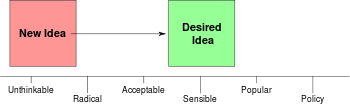 Contemporary commentators[12][13] have spun off the concept of "walking through the Overton door", to convey the easier and more timely task of advocating ideas that are becoming popular but not yet codified into law or policy.