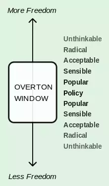 The Overton window is the range of policies politically acceptable to the mainstream population at a given time.[1] It is also known as the window of discourse. The term is named after American policy analyst Joseph P. Overton, who stated that an idea's political viability depends mainly on whether it falls within this range, rather than on politicians' individual preferences.[2][3] According to Overton, the window frames the range of policies that a politician can recommend without appearing too extreme to gain or keep public office given the climate of public opinion at that time.