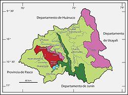 The Oxapampa Province is divided into eight districts (Spanish: distritos, singular: distrito), each of which is headed by a mayor (alcalde):