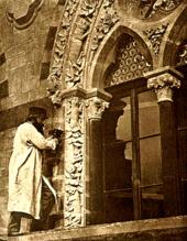 Statues of eminent men of science stand around the ground floor of the court—from Aristotle and Bacon through to Darwin and Linnaeus. Although the university paid for the construction of the building, the ornamentation was funded by public subscription, and much of it remains incomplete. The Irish stone carvers O'Shea and Whelan had been employed to create lively freehand carvings in the Gothic manner. When funding dried up, they offered to work unpaid, but they were accused by members of the University Convocation of "defacing" the building by adding unauthorised work. According to Acland, the O'Shea brothers responded by caricaturing the members of Convocation as parrots and owls in the carving over the building's entrance. Acland insists that he forced them to remove the heads from these carvings.[7]