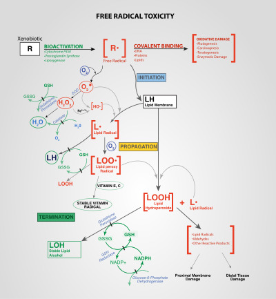 •OH, hydroxyl radical | Three-electron reduction state, formed by Fenton reaction and decomposition of peroxynitrite. Extremely reactive, will attack most cellular components |